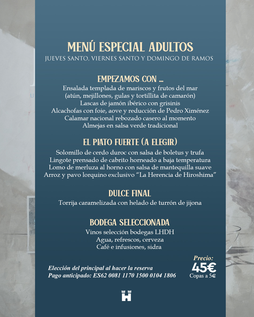 Para el mes de abril hemos preparado el menú más delicioso para que tu familia y tú celebréis la Semana Santa más esperada en nuestros salones. Podéis reservar vuestra mesa a partir de 2 comensales para los días viernes de dolores, Domingo de Ramos, Jueves Santo, Viernes Santo o Domingo de Resurrección.
